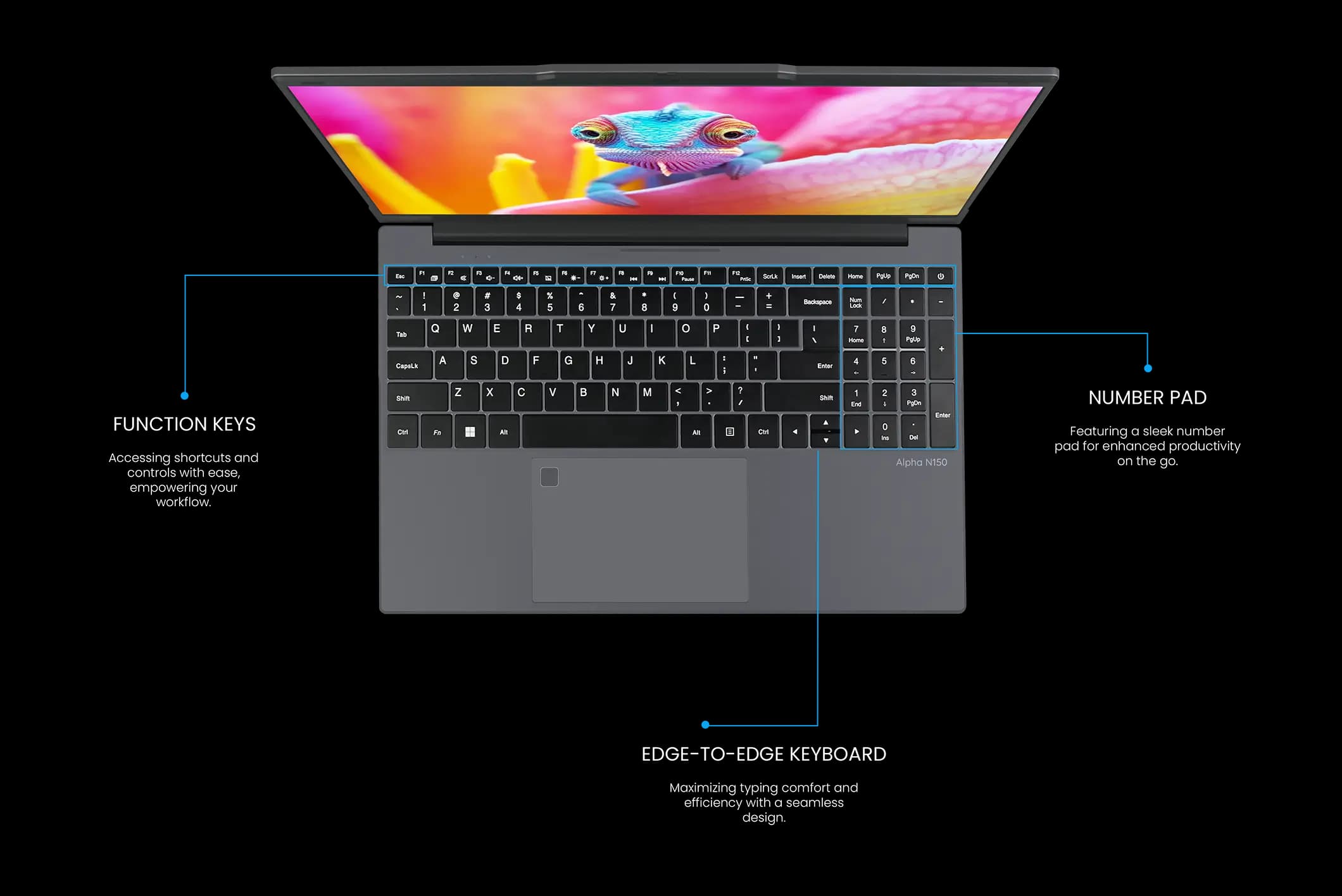 The Alpha N150 isn’t just a laptop—it’s performance refined. Powered by the Intel® 13th Gen Twin Lake-N Series N150 processor with speeds up to 3.60 GHz and crafted in an ultra-light design, it delivers effortless power, all-day mobility, and a truly elevated experience.